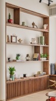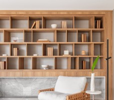 Разделительные деревянные стеллажи для комнаты активно используются в интерьерном дизайне. Они не только помогают поделить комнату на зоны, но и экономят пространство. Особенно хорошо выглядит совмещение деревянного стеллажа-перегородки с другими приемами зонирования. Например: