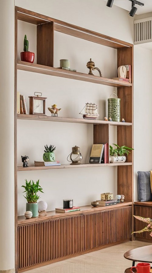 Полностью закрытый деревянный стеллаж — это обычный шкаф. А вот полузакрытый выглядит интереснее: часть полок в нем прикрыта дверцей, а остальные остаются на виду. Это позволяет убрать вещи, которые не подходят к интерьеру, в закрытую часть, а открытую уставить чем-нибудь красивым и интересным. Дверцы могут быть: